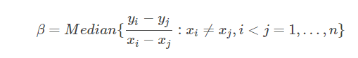 OLS方法是渐进无偏的,Theil-Sen方法在渐进无偏方面和OLS性能相似。和OLS方法不同的是,Theil-Sen方法是一种非参数方法,其对数据的潜在分布不做任何的假设。Theil-Sen方法是一种基于中值的估计其,所以其对异常点有更强的稳健性。