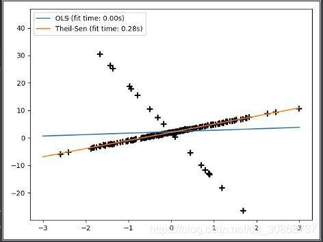 Theil-Sen回归是一个参数中值估计器,它适用泛化中值,对多维数据进行估计,因此其对多维的异常点(outliers 外点)有很强的稳健性。